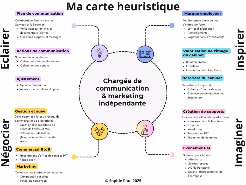 Je vous propose une carte d'idées, réalisée à partir de quatre verbes sélectionnés, des verbes d'action que j'utilise dans l'exercice de mon métier, au quotidien.